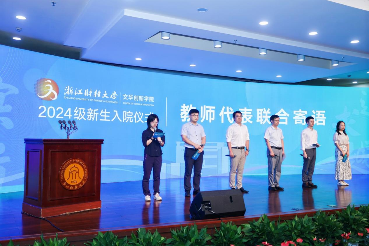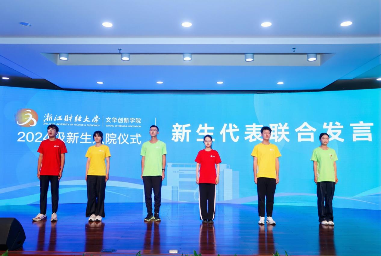 2024级新生代表上台发言。他们围绕“过去”与“未来”,表达了对知识的追求与报效祖国的责任感,表示将化挑战为机遇,砥砺奋斗,以百倍的热情和昂扬的斗志,努力成长成为一名MAQ型“完全之人物”的“浙财金生”和“文华金生”。