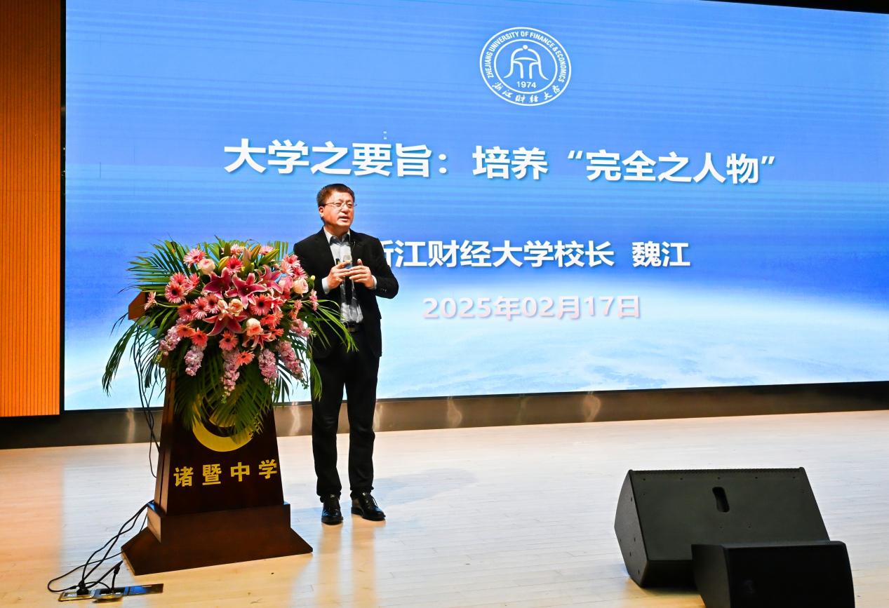 “学习的目的是什么?追求好成绩,考好大学是不是目的?”魏江深情回顾了自己在诸暨中学的求学之路。他从什么是大学说起,用生动有趣的悖论重新定义学习的意义,在青年心中播下了求学的种子。魏江讲述了大学的发展历程和财经学科的过去现在与将来,分析了当前教育之痛,展望了财经学科未来趋势,并提出了全面改造大学教育的“浙财方案”。魏江认为,教育的核心在于塑造灵魂。时代在不断发展变化,要放长眼光看问题,不要被眼前的分数、专业、就业等压力裹挟。他希望青年学生要通过加强身心健康的锻炼和毅力品格的培养,为大学毕业后的10年甚至20年铺好路,拥有更多的人生选择权。
