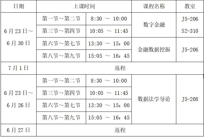 备注:《数字金融》课程需要上机操作,请同学们6月27日和28日这两天到实验室(S2-310)上课。