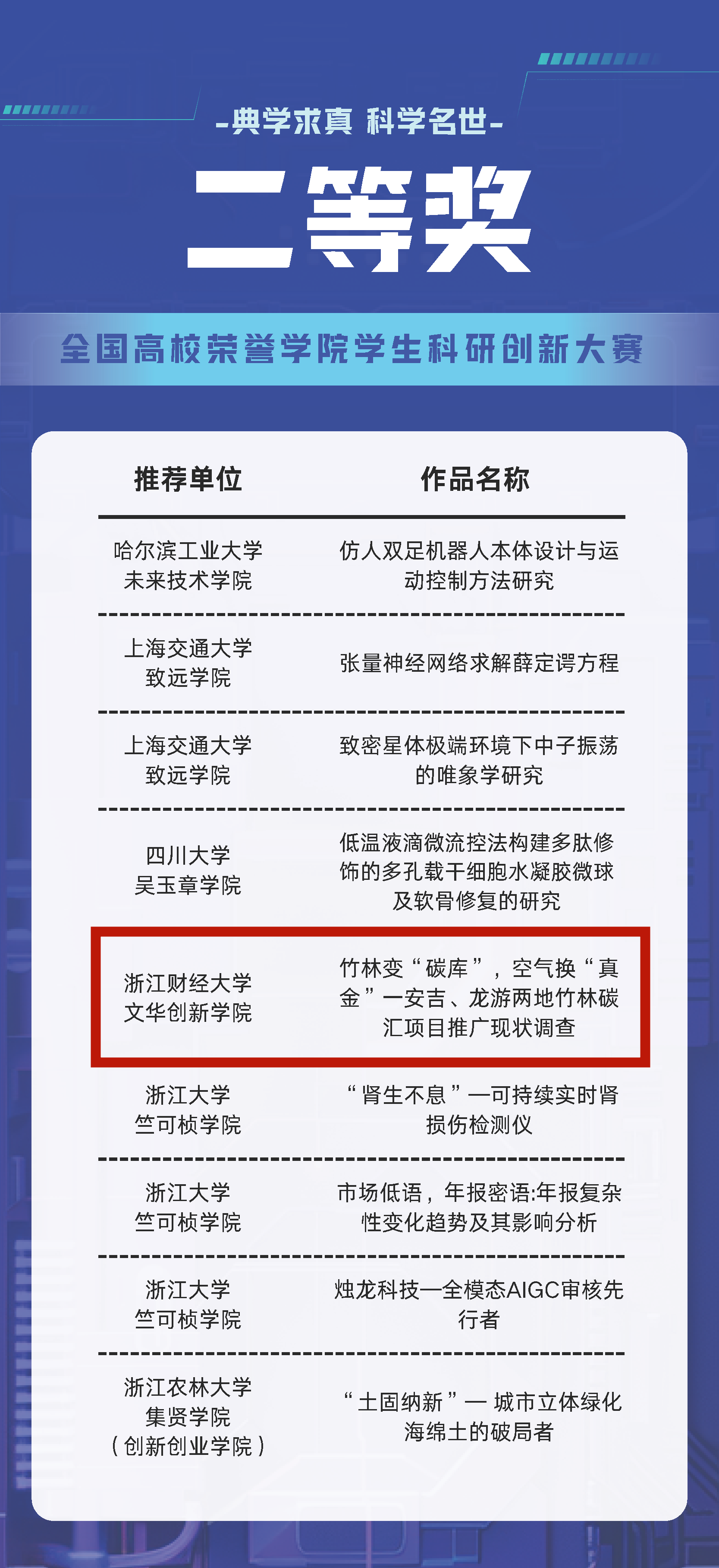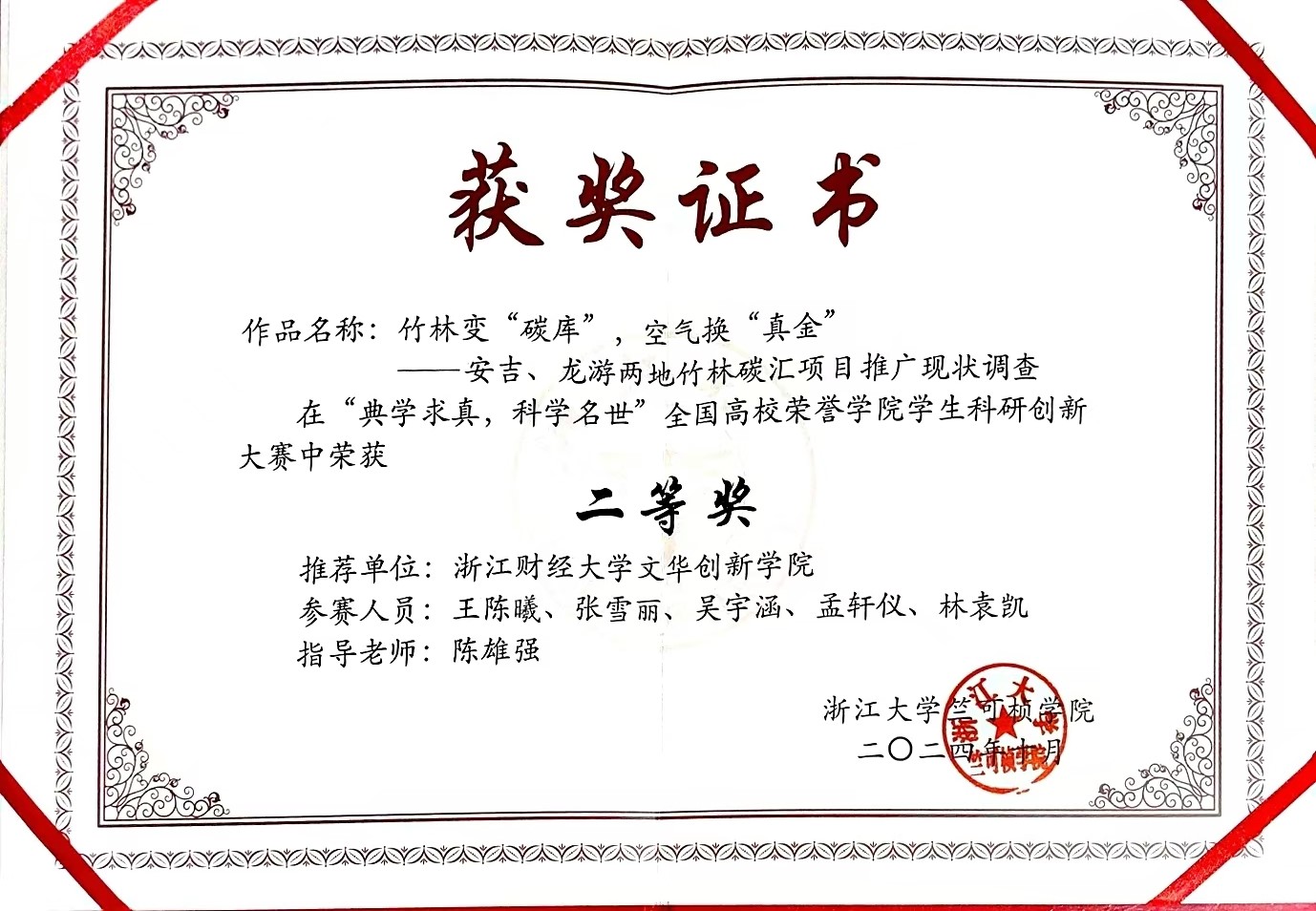 学子《竹林变“碳库”,空气换“真金”----安吉、龙游两地竹林碳汇项目推广现状调查》项目荣获二等奖。