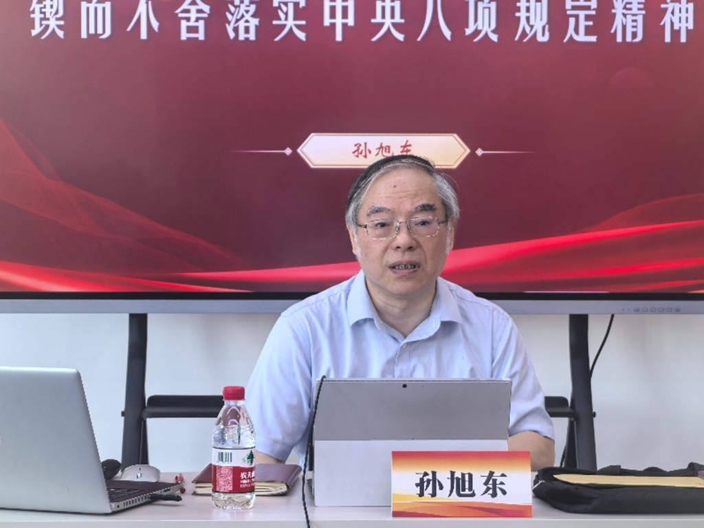 孙旭东以《锲而不舍落实中央八项规定精神》为题,详细解读了中央八项规定精神的历史脉络与现实意义。他指出,中央八项规定是新时代加强党的作风建设的重要内容、突出特点和鲜明标志,是对党的作风建设优良传统的继承和发展,当年“延安作风”打败“西安作风”,今天也要靠党的优良作风使“东风压倒西风”。他从4个方面讲述八项规定是党的十八大以来以习近平同志为核心的党中央治国理政的重要战略,以“十个坚持”总结新时代作风建设的鲜明特点,强调要锲而不舍落实中央八项规定精神,认真开展学习教育,准确把握“四风”问题,严防严治“四风”问题隐形变异、反弹回潮,高度警惕防治风腐同源、风腐交织、风腐一体的演变,坚持实干为先、担当作为、干事创业,把作风建设作为终身课题。